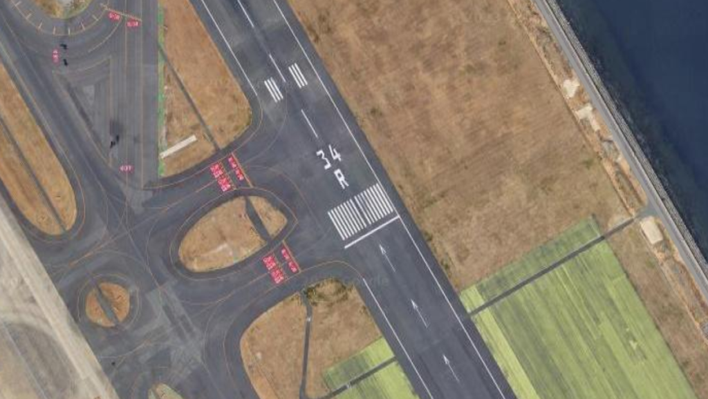 羽田空港のC滑走路(南側)の画像です。34Rと書いてあります。