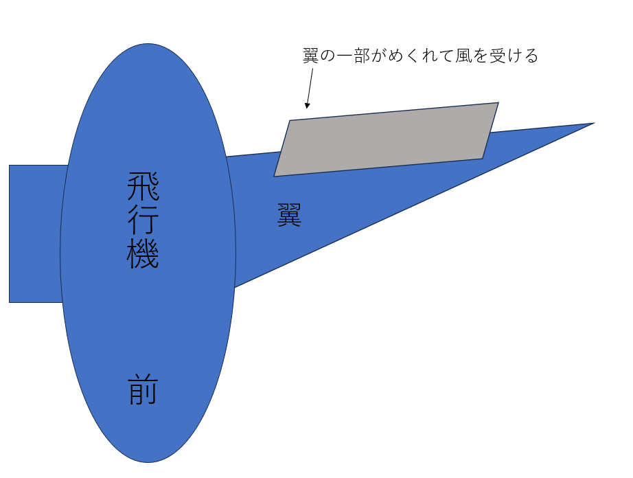 着陸時は向い風で、翼の一部で風を受ける面積を増やして機体のスピードをおとします。