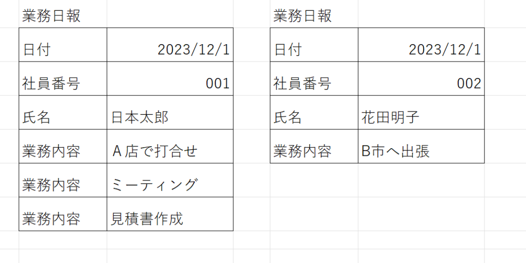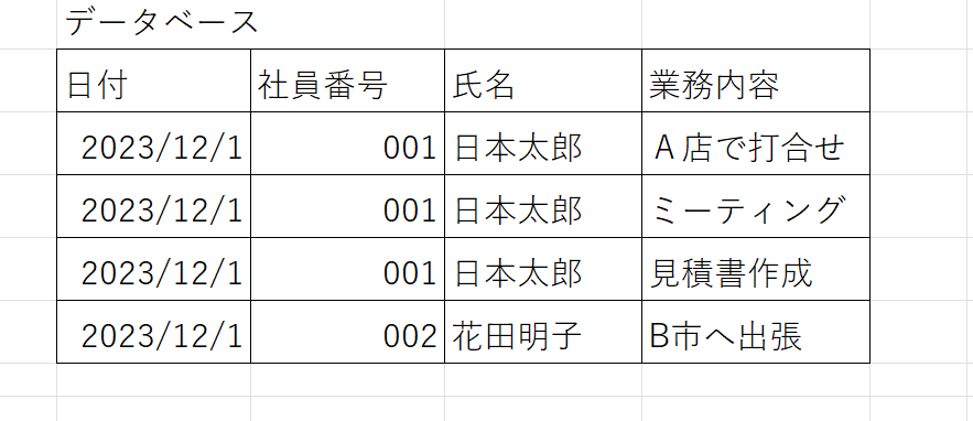 簡単な例ですが、このような業務日報を入力していく場合、データベースの中はこのようになります。
