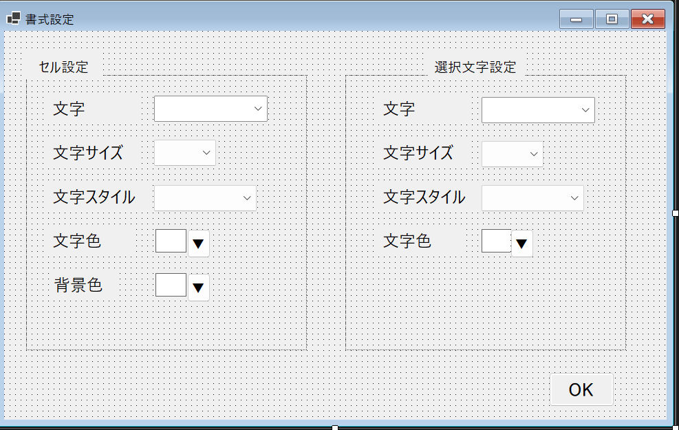上部の「セル設定」「選択文字」はボタンになっています。