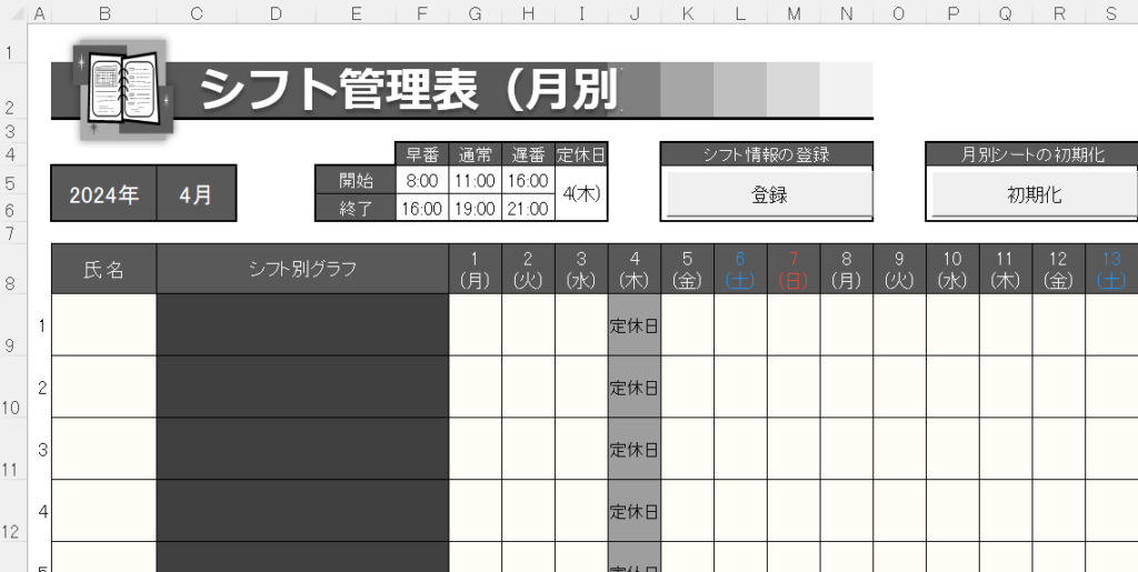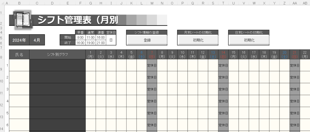 定休日の曜日をいれれば、カレンダーに定休日が自動でセットされます。