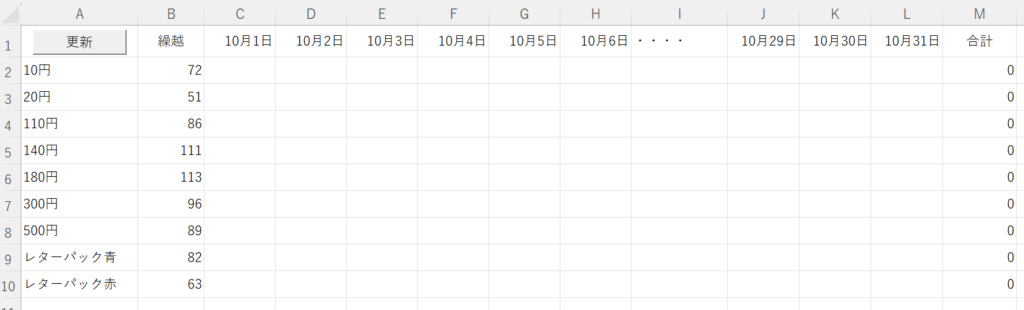 郵便料金が値上げになり、切手の種類が増えたので行を追加した。