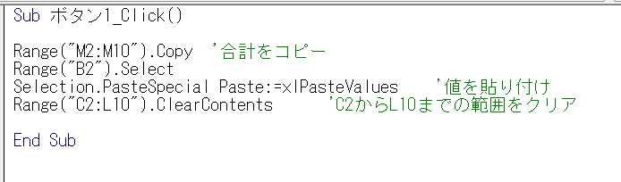 内容をきいていると、M列の合計をB列に貼り付けしてC2からL10をクリア