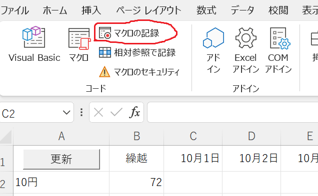エクセルの開発タブにあるマクロの記録をクリックします。