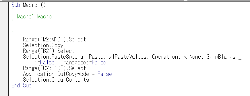 Macro1(マクロの記録で作ったコード8行分)を選択して