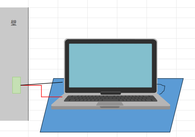以前のPCは赤の線のように電源をつないでいたのですが、新しいPCは